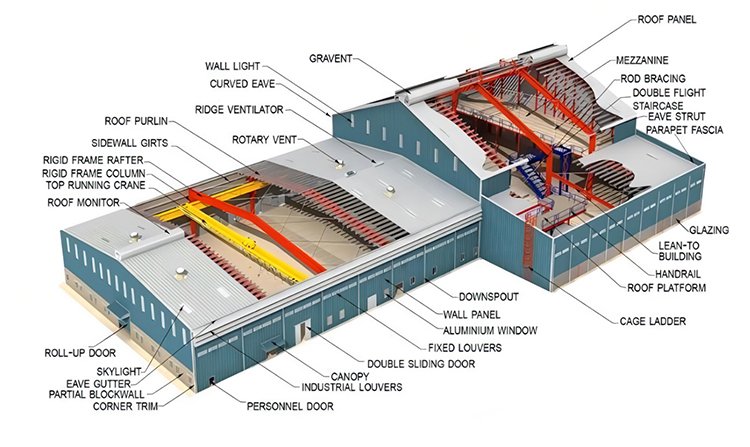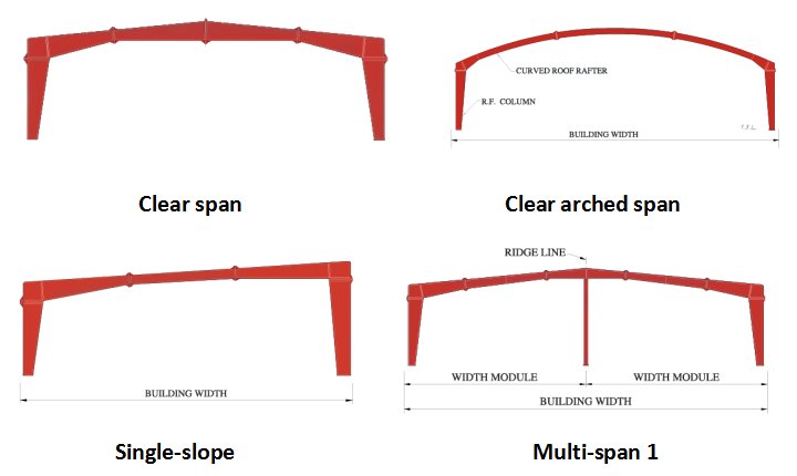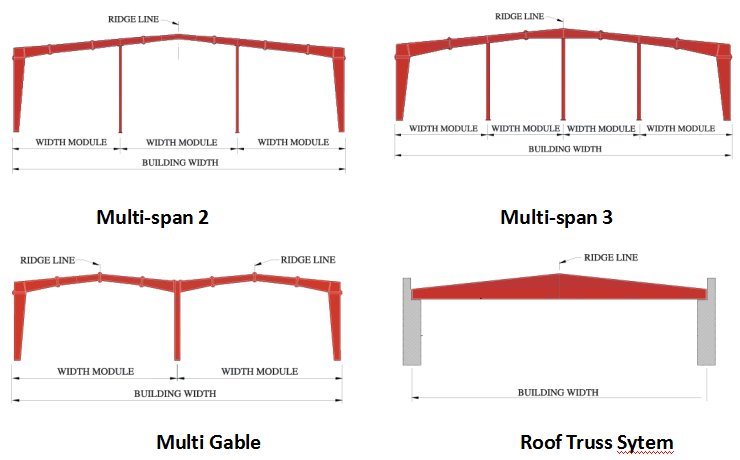 鋼架主要由型鋼、鋼闆制成的鋼梁、鋼柱、鋼桁架等構件組成,并采用抛丸、噴漆、鍍鋅等除鏽、防鏽工藝。通常采用焊接、螺栓或鉚釘來連接各個構件或部件。我們的預制鋼結構建築經過定制設計,可滿足您的具體要求。最常見的主要框架系統如下所示。實際上任何框架幾何形狀都是可能的。