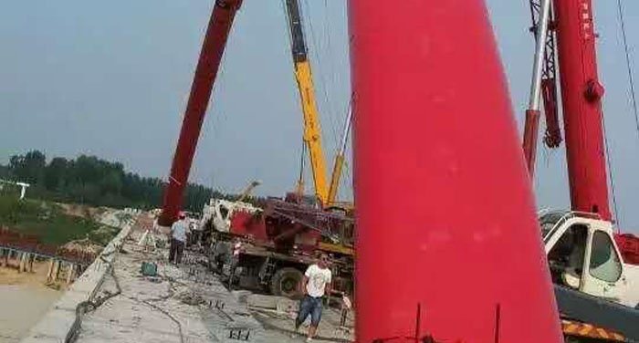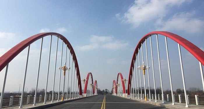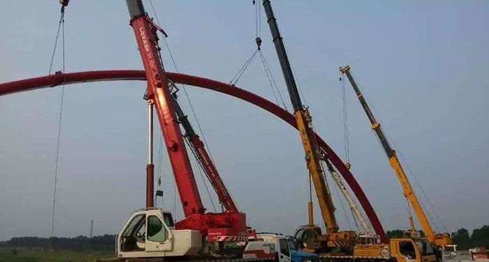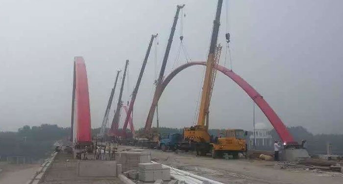 工程概況:2015年建設,橋下有水,多台汽車吊在橋面上配合吊裝和拼接。