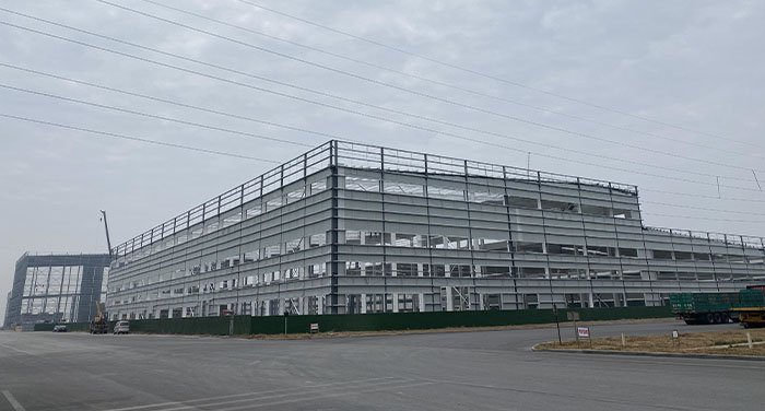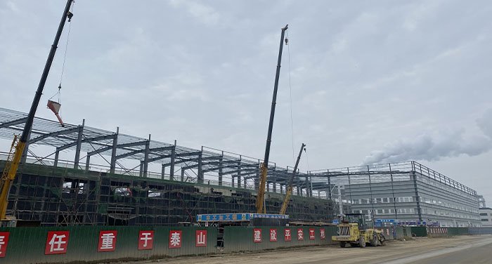 工程概況:2019年建設,建築面積53300平米,因為搶工期,兩家公司合作建設,我們建設的部分檐口高度42米,杯口基礎,多節柱子拼接吊裝,總用鋼量約2800噸左右。