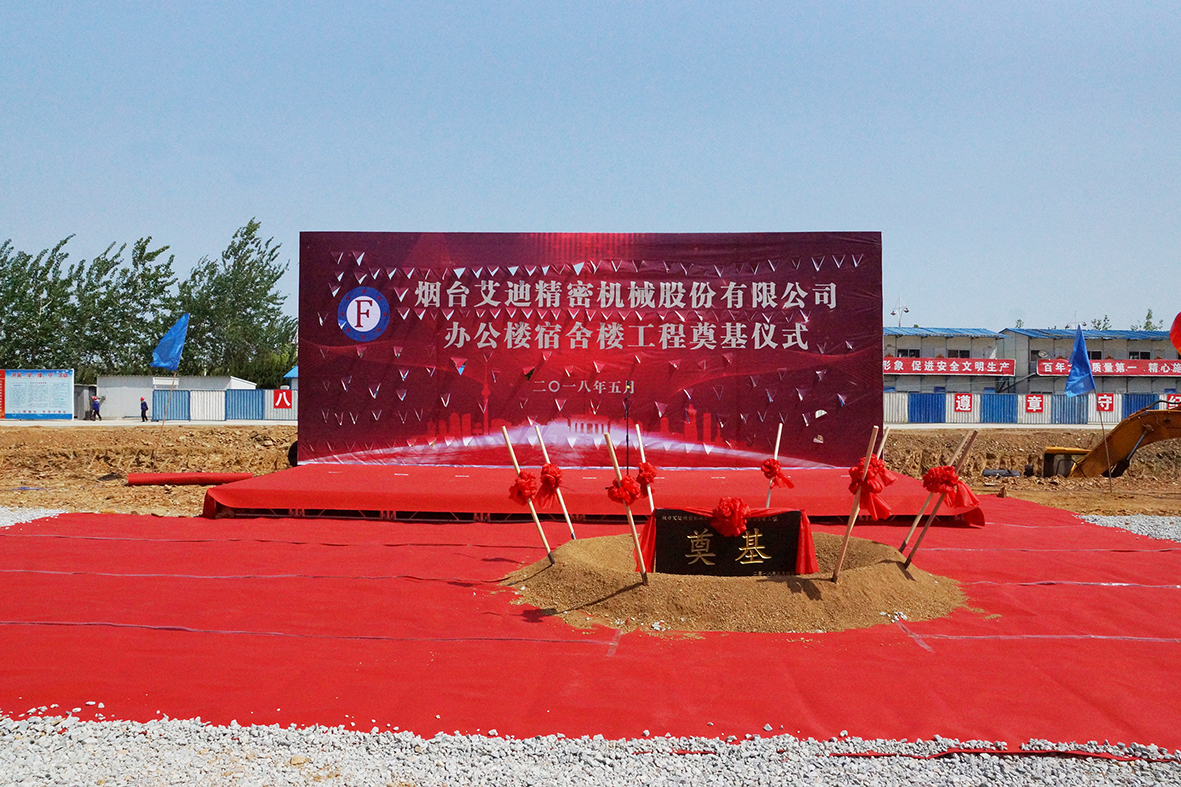 2018年5月4日上午10点,烟台艾迪精密机械股份有限公司办公楼、宿舍楼工程奠基仪式在工地现场隆重举行。参加此次庆典的有,烟台艾迪精密机械股份有限公司董事长宋飞先生、烟台飞龙集团有限公司董事长宋勇先生等公司领导及全体员工。