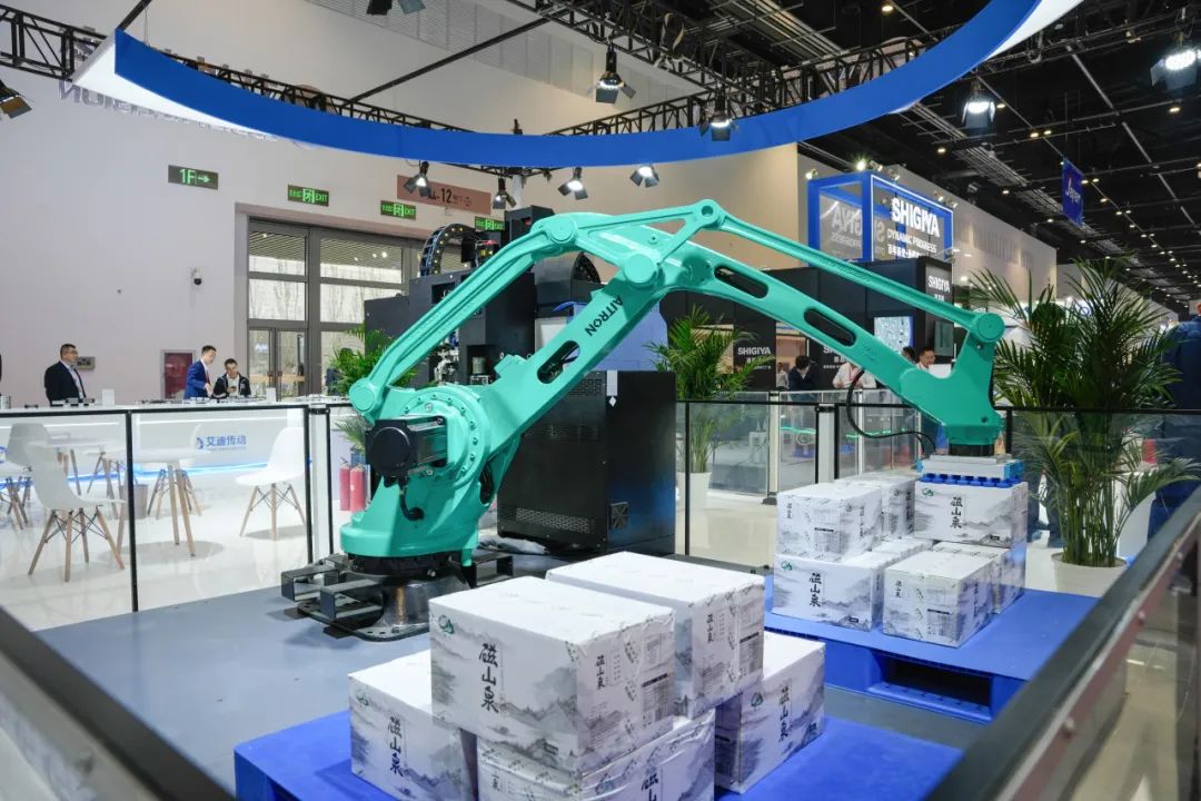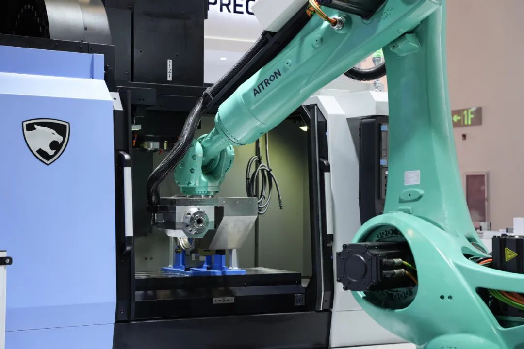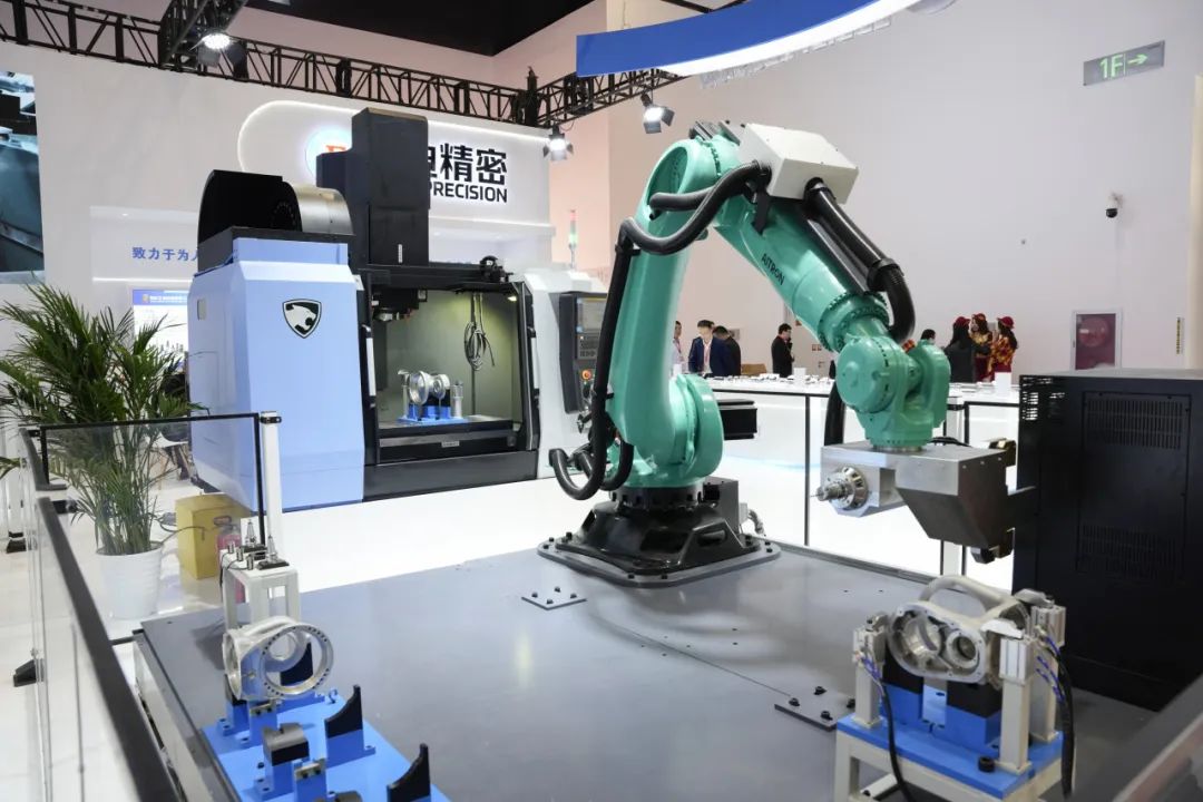 艾创科技作为智能化先锋,现场演示了两大核心工作站:机床上下料工作站搭载自主研发的210KG机器人,凭借复合式加工取料一体式夹具,实现了从零部件加工、刀具切换到产品抓取的全流程自动化,其末端力反馈控制技术充分展现了精准性与稳定性;码垛工作站则采用110KG机器人,结合空气吸盘技术高效完成物料搬运,触摸屏点位示教功能简化编程流程,助力企业提高生产效率。目前,艾迪精密智能制造产业园的自动化生产线已投入使用近200台由艾创科技自主研发的工业机器人,可实现生产效率提升30%以上。